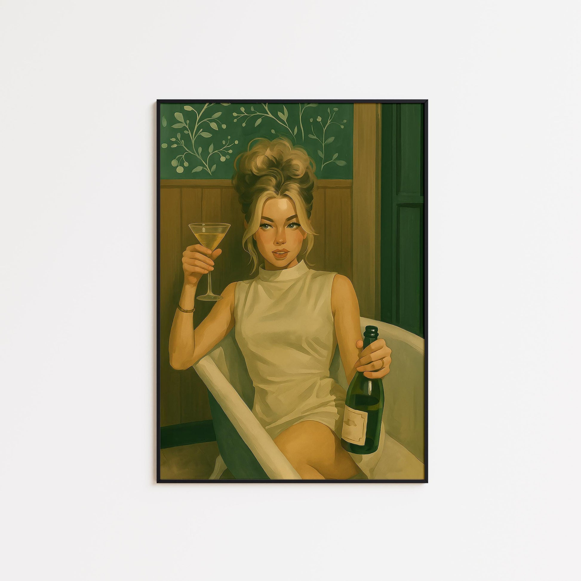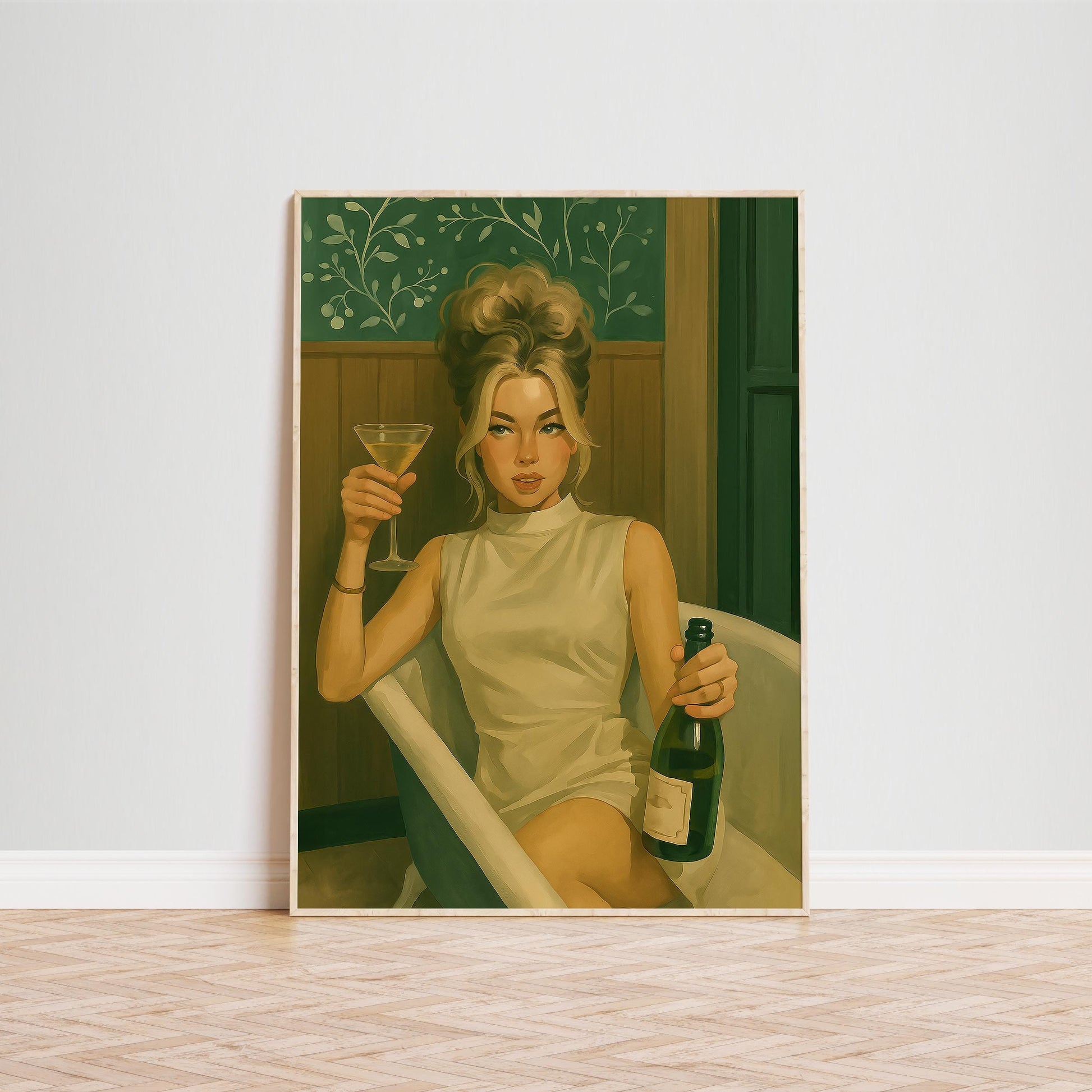 Vintage Glamour Art Print – Golden Hour Martini Olive Green Wall Art