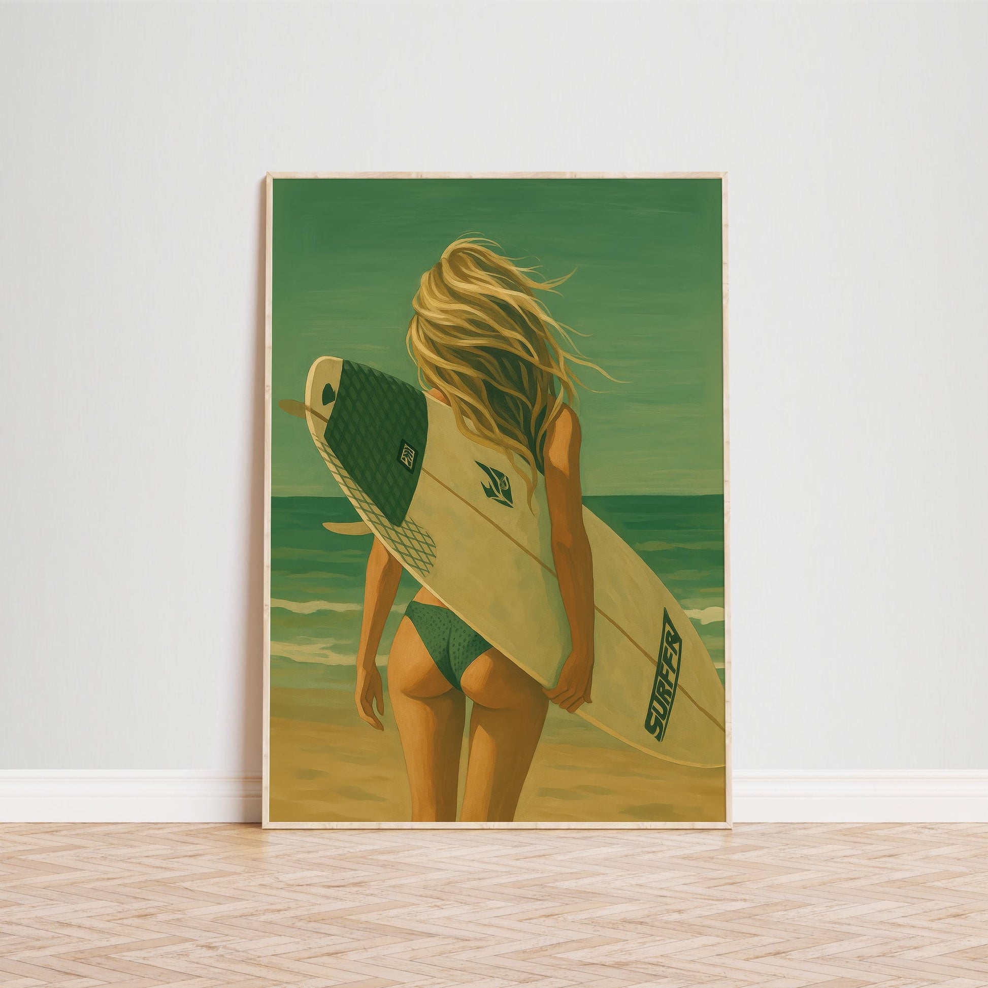 Vintage Surfer Girl Poster – Retro Beach Wall Art With Warm Coastal Tones