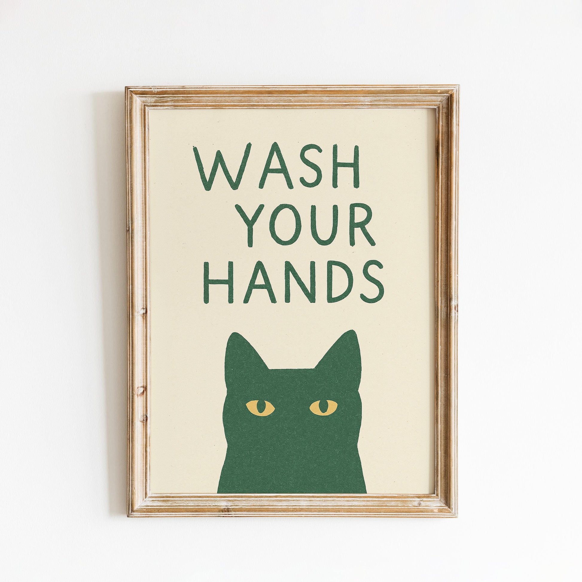Wash Your Hands Cat Poster – Funny Bathroom Wall Art in Minimal Green