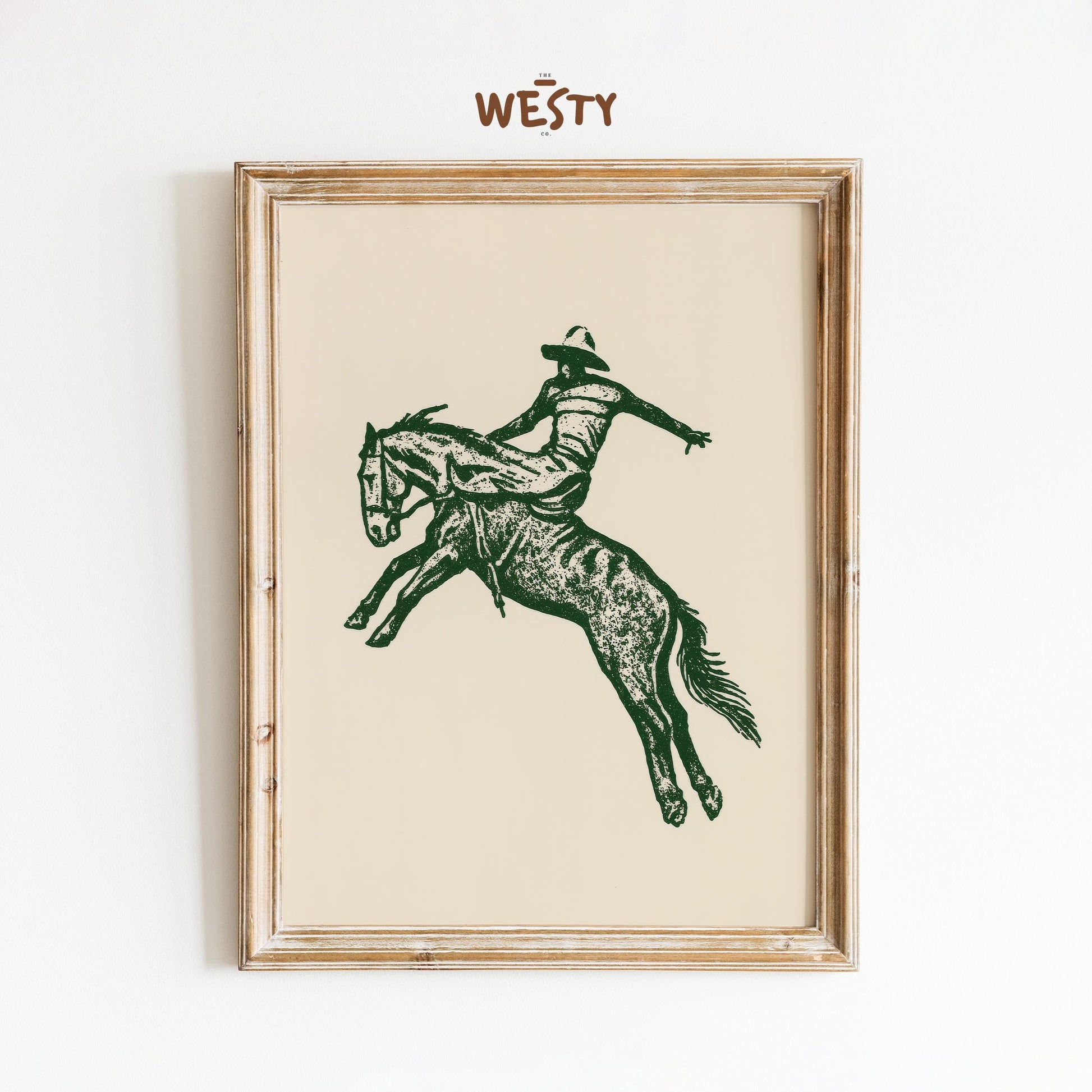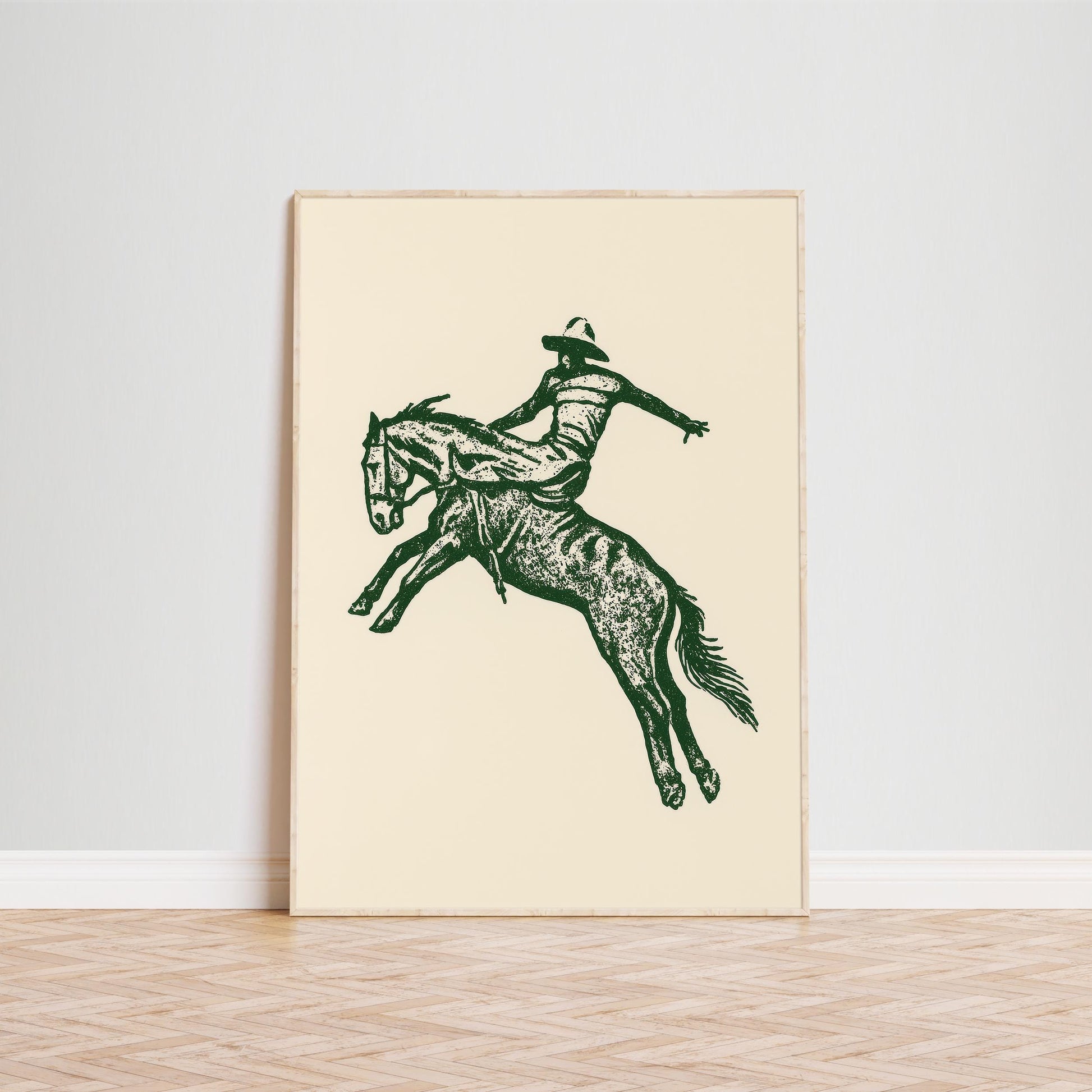 Western Cowboy Rodeo Art Print – Vintage Bronco Silhouette in Forest Green