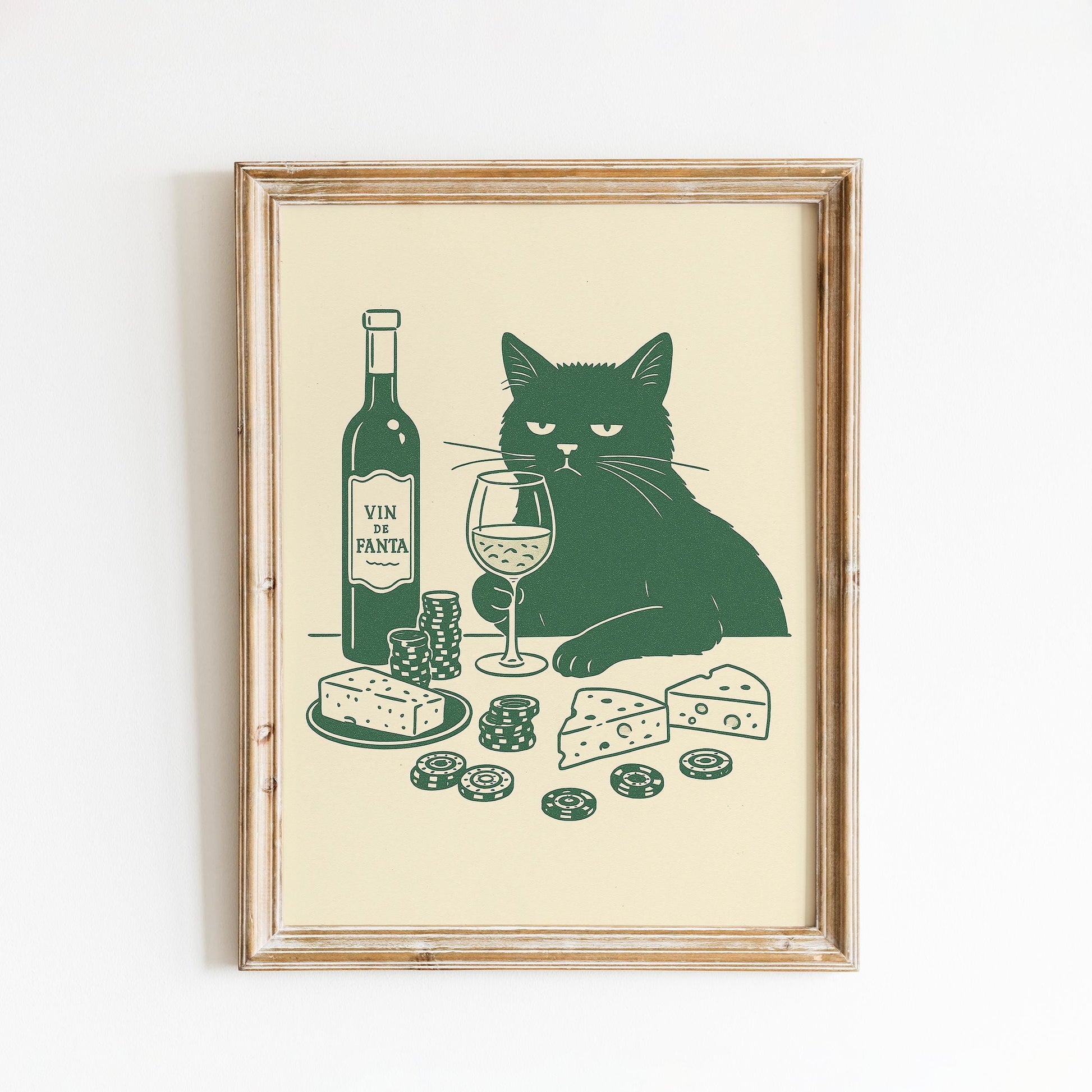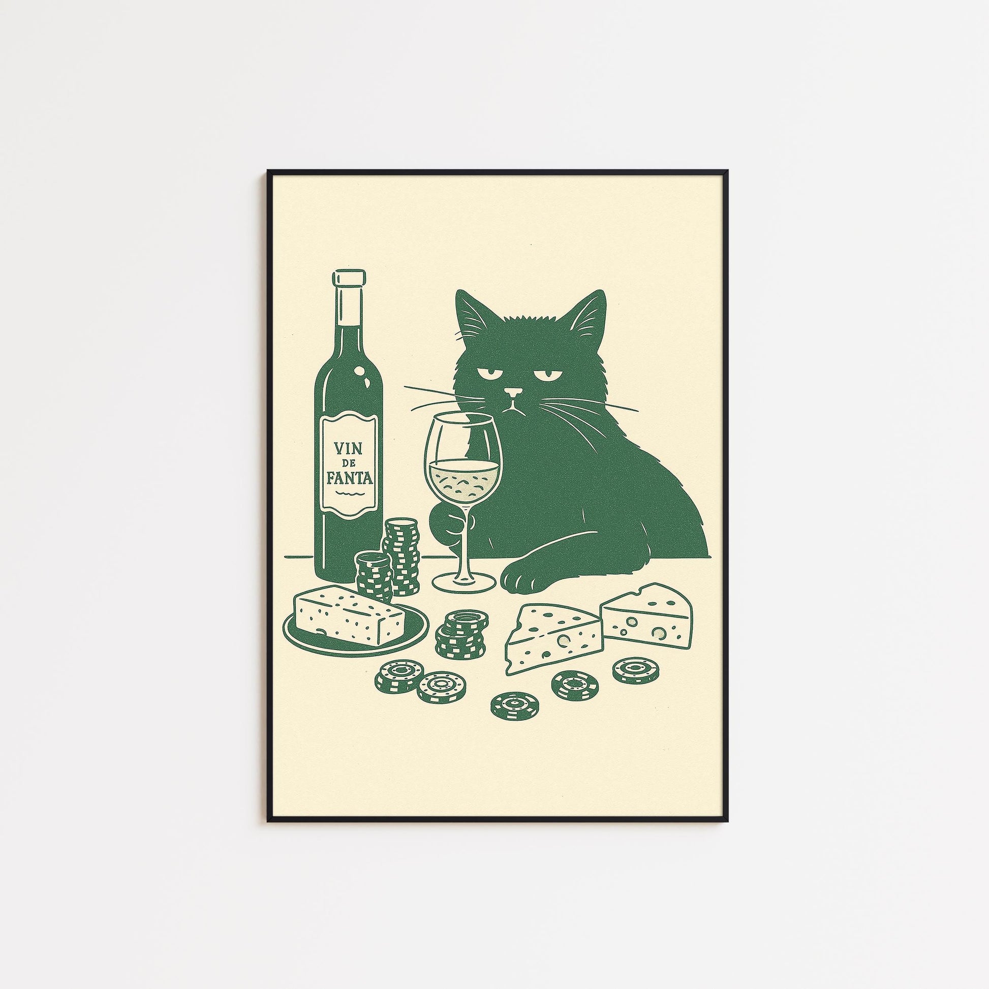 Wine and Cheese Cat Poster – Funny Minimal Line Art, Sophisticated Cat Wall Print