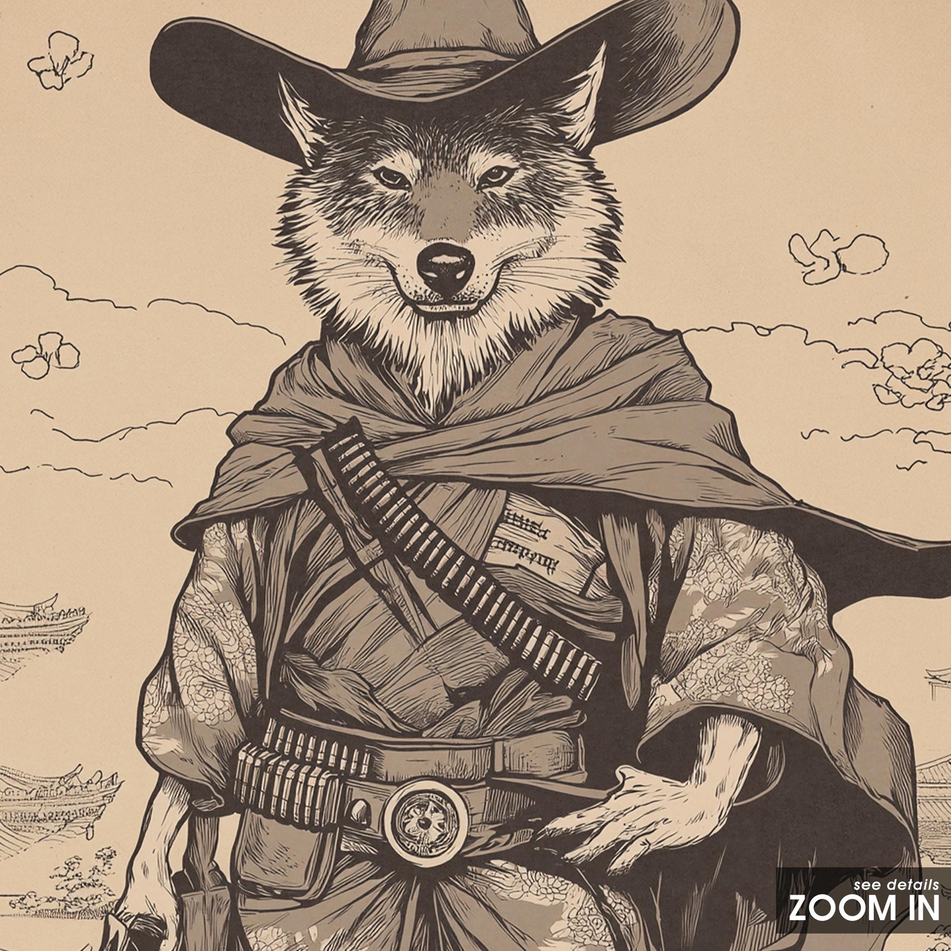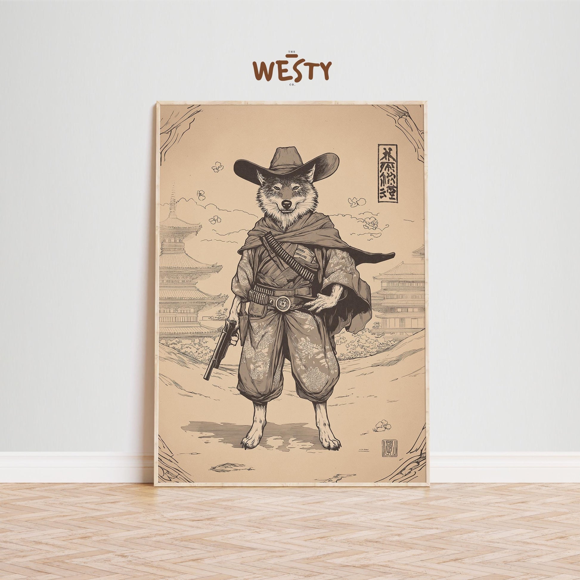 Wolf Gunslinger Samurai Poster – Sepia East-West Fusion Wall Art